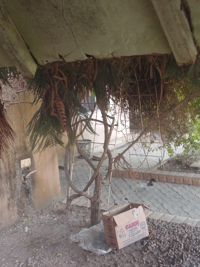The image displays an outdoor scene located in the city of Akwanga, Nigeria. The perspective is looking slightly upwards, beneath an overhead structure. The upper portion of the frame shows the underside of a light-colored roof or overhang, exhibiting cracks and signs of wear. Densely packed green and dried brown needle-like foliage hangs from this structure, partially obscuring the view beyond. In the mid-ground, a small tree or large shrub with intertwined, gnarled brown branches stands. Its branches extend into a light-colored metal grid structure, possibly a gate or trellis, which is visible behind the foliage. To the left, a light brown, stuccoed wall with vertical dark streaks and discoloration at its base is present. A small, light-colored electrical junction box with visible wiring is mounted low on this wall. The ground transitions from loose dirt and light-colored gravel in the foreground to a paved area in the mid-ground. The paved area consists of light gray rectangular interlocking pavers arranged in a diagonal pattern. A single row of dark brown tiles forms a low border separating the paved section from an unpaved, sparsely vegetated area. On the paved area in the distance, a dark, cylindrical, open-top waste bin is visible. In the immediate foreground, resting on the gravel, is a partially open, light brown cardboard box. The box is labeled "CABIN SWEETENED BISCUITS" with accompanying graphics. A transparent plastic sheet is visible beneath or next to the box. No individuals or active interactions are present in the scene.