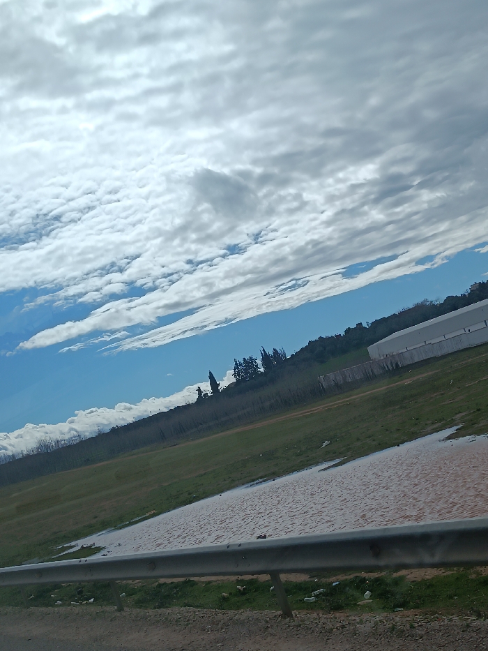 The image depicts a rural or semi-industrial landscape in Majjate, Morocco, under a partially cloudy sky. The scene is tilted, with the horizon line diagonally ascending from left to right. The upper portion of the frame features a sky predominantly covered by extensive white and grey stratocumulus clouds, with visible patches of clear blue sky. The midground consists of an expansive green field. A significant portion of this field, specifically in the lower-mid section, is covered by a large, irregularly shaped body of reddish-brown, muddy water, suggesting a flooded area or large puddle. Along the distant horizon, a dense line of trees and vegetation is present. To the far right, a large, low-rise industrial-style building with a white exterior and a dark roofline is partially visible behind the trees. In the immediate foreground, a silver-colored metal guardrail extends horizontally across the lower part of the image, indicating the presence of a roadside. Below the guardrail, the ground is composed of dirt and sparse grass, with scattered white debris visible. No individuals or animals are present in the frame.