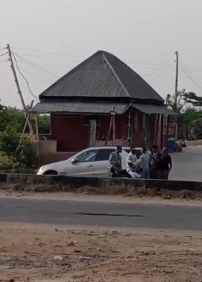 roadside scene in what appears to be a rural or developing area. There is a small brick building with a dark grey, peaked roof situated just off the road. A group of five or six people are gathered near a white SUV parked in front of the building. There is a second car further up the road with a third car behind it. Chickens are also visible in the video wandering on the side of the road. The road itself is paved but shows signs of wear and tear, and the surrounding area is dusty and unpaved. Palm trees are scattered in the background.