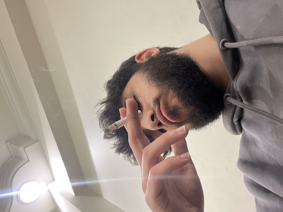 A low-angle view depicts a person with a dark beard holding a lit cigarette. Smoke drifts above the hand. The person wears a gray hoodie. A portion of a ceiling is visible in the background, with a decorative molding and a round, bright light source. The angle suggests the photo was taken from below the subject, looking upwards.