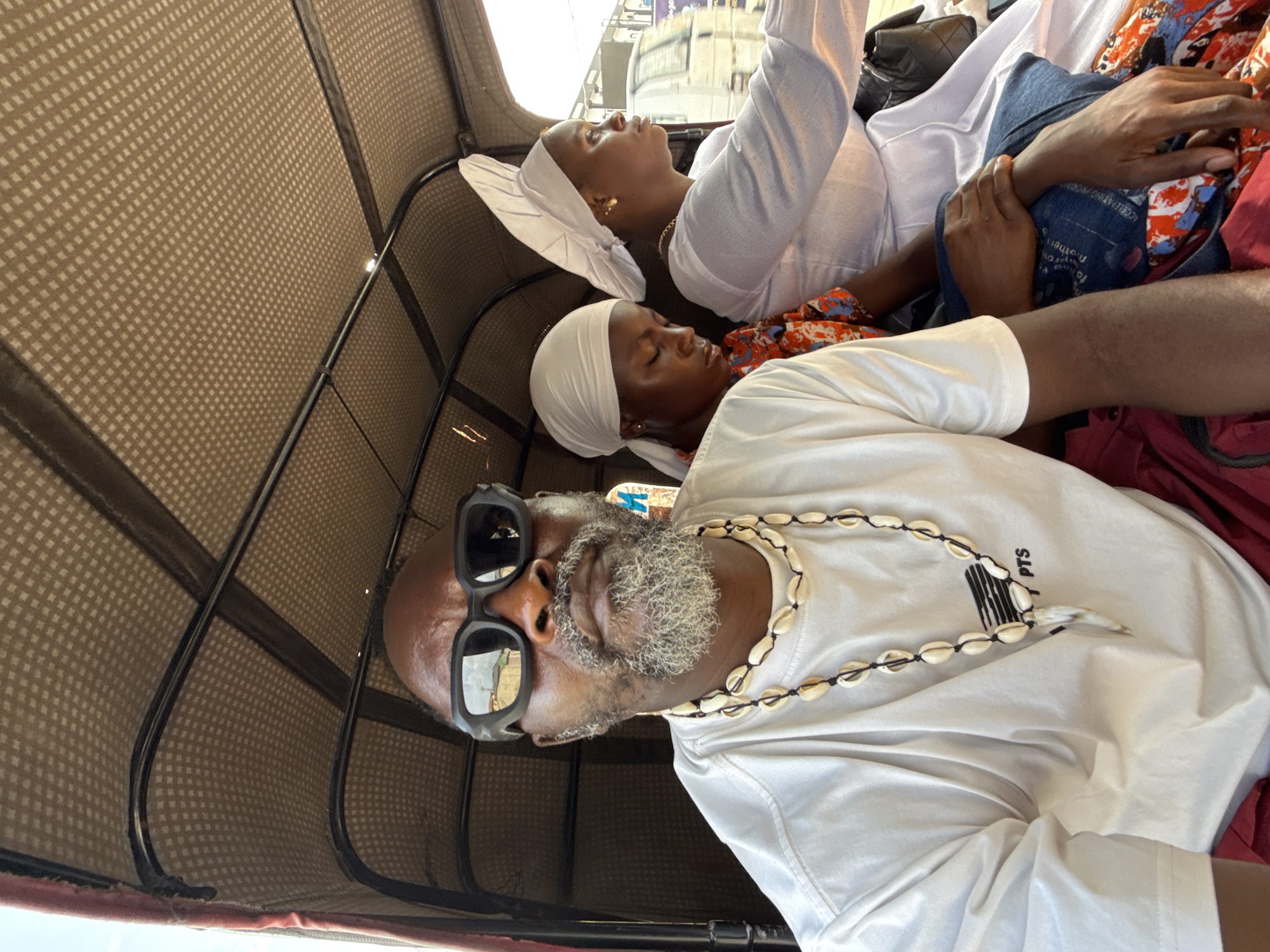 Three people are inside a vehicle, presumably a taxi, in Ado, Nigeria. Two women in white head coverings and matching outfits are sleeping. One woman has a white head covering with a frilly brim. The other woman has a white cloth wrapped around her head. A man in sunglasses and a white shirt with a cowrie shell necklace is looking at the camera. The roof of the vehicle has a tan and white patterned material.