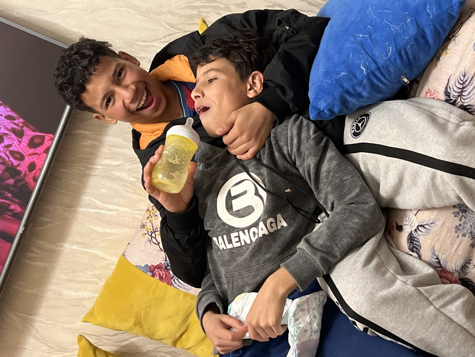 Two boys are lying on a patterned bedspread. One boy, wearing a black and yellow jacket, smiles broadly while playfully holding a bottle near the other boy's face. The second boy, wearing a grey Balenciaga hoodie and a diaper, looks slightly uncomfortable as the first boy has his arm around his neck. Pillows in yellow, blue, and floral patterns surround them. A television is visible in the background.