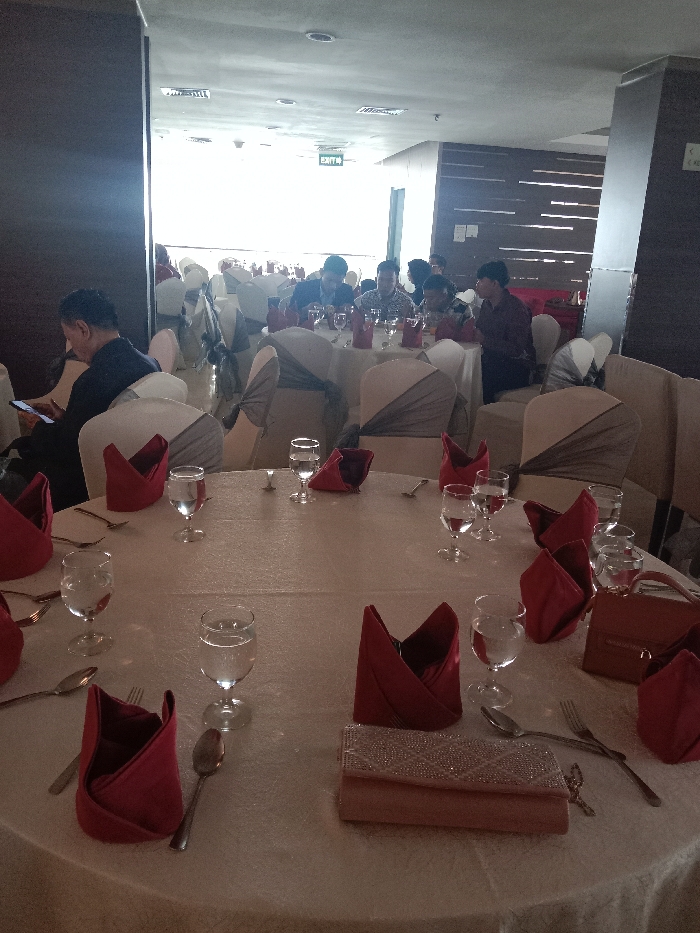 A banquet room scene depicts a circular table set for a meal, featuring red napkins, glasses, silverware, and women's purses. In the background, more tables with seated individuals are visible, suggesting a gathering or event. The chairs are adorned with grey sashes. A man using a phone is also present. The lighting is bright, with an "EXIT" sign noticeable.
