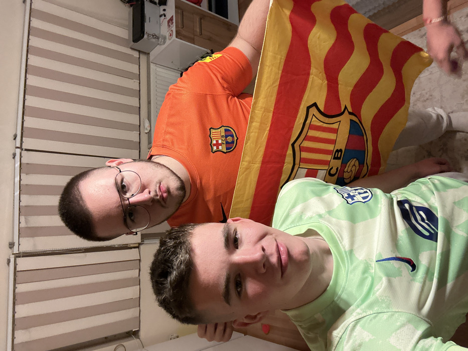 Two males are depicted in an indoor residential setting, likely in Haskovo, Bulgaria. The foreground shows a young male with short, light brown hair, wearing a light green athletic jersey with a small FC Barcelona crest on the left chest and a blue Nike swoosh on the right. He looks directly at the camera with a slight smile, his left arm out of frame, suggesting he is taking the photograph. Behind him stands a second male with a short buzz cut and clear-framed glasses, wearing an orange athletic jersey with a prominent FC Barcelona crest on the left chest and a black Nike swoosh on the right. His left hand rests on the head of the foreground male. He holds a rectangular flag, partially unfurled, featuring red and yellow horizontal stripes and a large FC Barcelona crest. This male looks directly at the camera with a neutral expression. The background features vertical beige and white striped blinds covering a window or opening, and to the right, a white Brother brand printer/scanner is visible atop a light wooden cabinet. The lighting is artificial, casting minimal shadows.