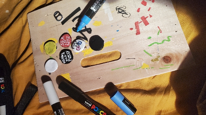 This image depicts a collection of art supplies and small decorative items arranged on a light-colored wooden board, which rests on a wrinkled yellow-orange fabric surface. The scene is located in the city of Guérigny, France. On the wooden board, several items are visible: - Six circular badges are arranged, including a plain white badge, a yellow badge, a red badge, a black badge with white text "WANNA EAT PUSSY", a red badge with white text "SEX IS LIFE", and a white badge with a pink and blue bicycle graphic and "FIXED" text. A plain black badge is also present. - A light brown, elongated, rounded wooden stick is positioned vertically. - A metallic ring pull is located at the top right of the board. - The board itself shows various abstract markings and scribbles in yellow, green, red, black, and blue. A black outline drawing of a bicycle is present on the right side, and a circular wood knot is visible in the lower left section. Several Uni POSCA markers are present: - A black marker, cap removed, lies diagonally on the left side of the board. - A light blue marker, cap separated, is positioned horizontally near the bottom left. - A dark blue marker with a light blue cap is positioned diagonally on the right side of the board. - Additional marker components, possibly a cap or part of another marker, are partially visible on the yellow-orange fabric at the top left. The fabric surface is heavily creased, indicating a soft, pliable material. Lighting suggests a single source from the left, creating shadows from the markers and badges onto the board and fabric. No individuals are present in the image.