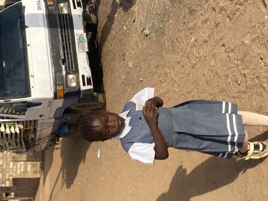 In the city of Du, Nigeria, a young Black child stands on a reddish-brown dirt road