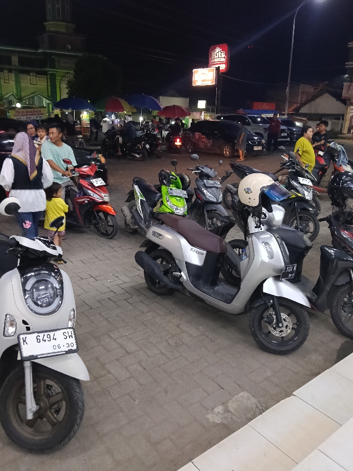 The image captures a nocturnal scene in Sumberejo, Indonesia, depicting a bustling outdoor paved area, likely a parking lot or plaza, bordered by commercial establishments and a street. In the immediate foreground, a light beige Honda Scoopy scooter (license plate K 6494 SW, valid until 06-30) is parked, facing forward. To its right, a silver Yamaha Fazzio scooter with a brown seat (partially visible license plate ending 5124 WR) is parked, displaying a beige helmet on its handlebars. The ground consists of grey interlocking concrete pavers. In the mid-ground, a group of individuals and additional motorbikes are present. A man in a light blue t-shirt sits astride a red Honda Vario scooter (partially visible license plate beginning B #### U). To his left stands a woman wearing a white top, dark vest, and purple hijab, holding a white helmet. A young child in a yellow t-shirt stands next to the woman, facing the man on the scooter. Various other scooters, including green, black, and grey models, are parked throughout this section. To the far right, a woman in a yellow shirt and dark pants stands near a cluster of parked scooters, facing right. The background reveals a street or open thoroughfare with several parked automobiles, including a dark hatchback and a white SUV. Multiple street vendor stalls operate under colorful umbrellas (blue, red, multi-colored), suggesting commercial activity. To the far left background, a green building featuring a minaret-like structure and a dome, characteristic of a mosque, is visible. To the right, a prominent, illuminated red sign for "Hits Chicken" is mounted on a commercial building. The entire scene is artificially lit by streetlights, building lights, and vehicle headlamps, indicating nighttime conditions.
