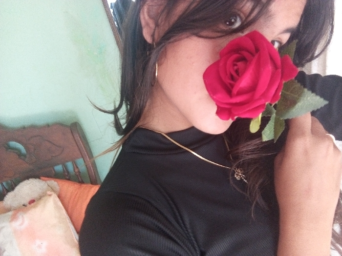 The image displays a close-up, slightly off-center portrait of an individual in an indoor setting. The subject, likely female, has dark hair, a visible right eye, and is wearing a black, ribbed, long-sleeved top. A thin, gold-colored chain necklace with a small pendant is visible around her neck, and a gold-colored hoop earring is present on her right ear. Her left hand is positioned near her face, holding a red artificial rose with green leaves. The rose obscures a portion of her lower face, specifically the nose and mouth area. The background features a light green wall, which exhibits some faint discoloration or texture. To the lower left, part of a wooden chair with blue accents is visible. Adjacent to the chair, an orange pillow, a light-colored pillow with a subtle pattern, and a portion of a white stuffed animal (possibly a bear) are present. The scene is illuminated, suggesting ambient indoor lighting. The specific location within Juan Griego, Venezuela, cannot be determined from the visual content provided.