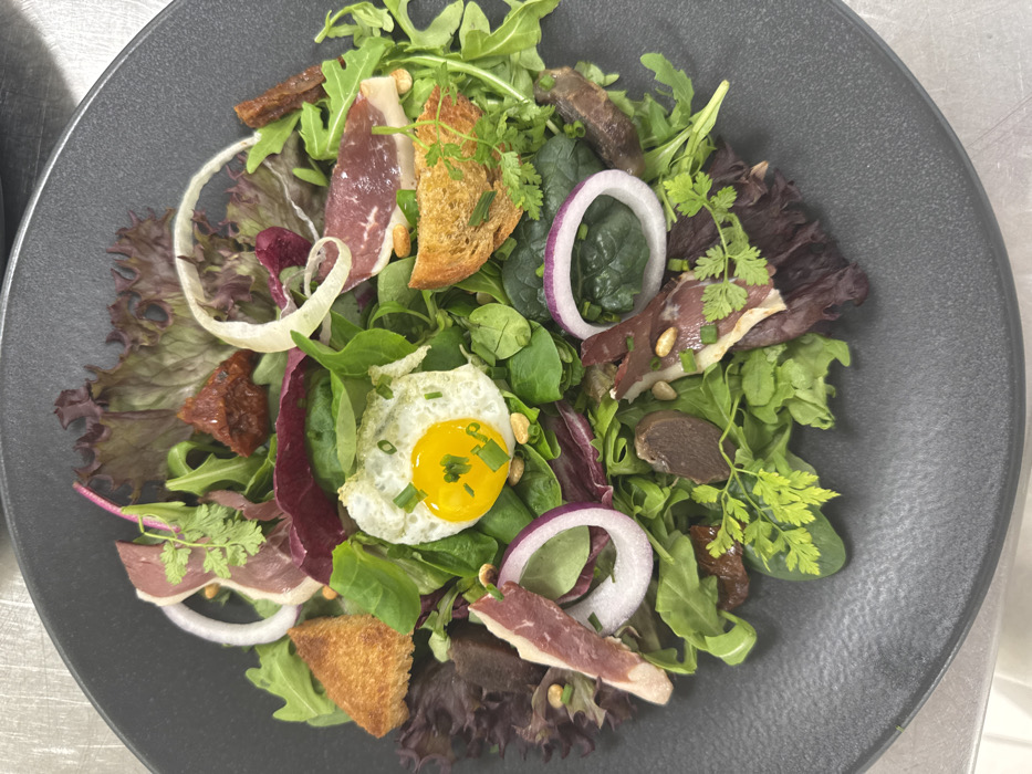 The image presents an overhead, close-up view of a freshly prepared salad served on a dark grey, textured round plate. The salad features a diverse mix of green and red leaf lettuces, including visible arugula. Key ingredients include several thin slices of cured duck breast, multiple golden-brown triangular croutons, thin rings of red onion, and small pieces of sun-dried tomato. A single fried quail egg with a vibrant yellow yolk, garnished with chopped chives, is centrally positioned. Pine nuts are scattered throughout, along with sprigs of fresh green herbs. The plate rests on a reflective, metallic surface, indicative of a commercial kitchen countertop. This scene is located in the city of Schiltigheim, France.