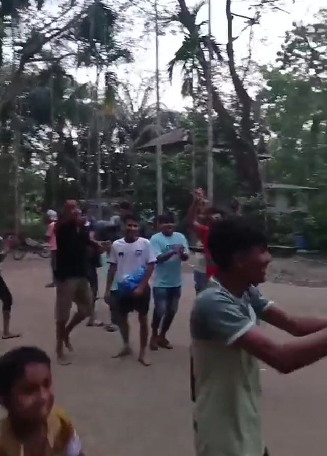 A group of at least 15 people, mostly young men, are gathered in an open, dirt-covered area with trees including several palm trees. They are actively celebrating, gesturing with their hands, and shouting. The sky is overcast. Some people are wearing shorts and t-shirts, while others are in more casual attire. The scene appears to be taking place in a rural or semi-rural location.