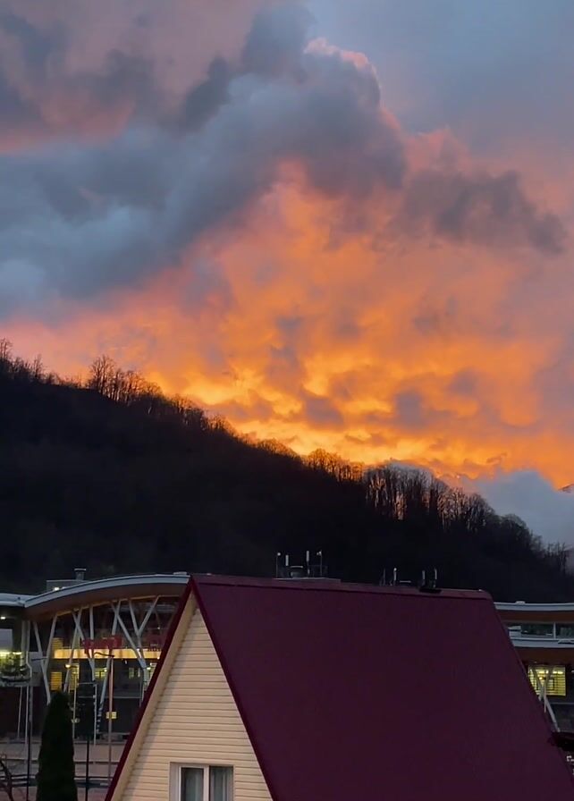 The video captures a stunning orange sunset in a mountainous area. In the foreground, there is a building with a white exterior and a dark red roof. Behind it, a tree-covered hillside stretches towards a snow-capped mountain, partially obscured by the surrounding clouds. The sky is filled with dramatic clouds illuminated by the setting sun, creating a vibrant contrast between the warm orange hues and the cooler gray tones.
