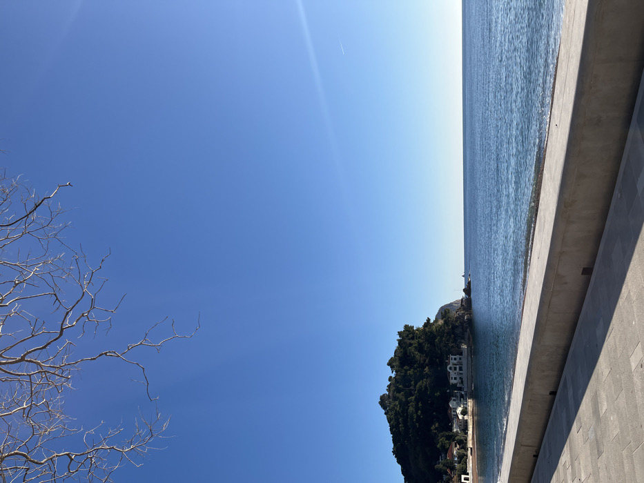 The image captures a static coastal scene in Petrovac centar, Montenegro, under clear blue skies. The top half of the frame is dominated by an uninterrupted, deep blue sky, with a network of bare, light-colored tree branches partially obscuring the upper left corner. A faint, linear contrail is visible in the far upper right sky quadrant. The lower half of the frame features the Adriatic Sea, with calm, blue-green waters extending horizontally to a distant horizon line. In the mid-ground on the left, a prominent, verdant headland covered in dense, dark green foliage extends into the sea. At the base of this headland, along a small crescent-shaped bay, several white and light-colored multi-story buildings with red or brown roofs are situated adjacent to a narrow, light-colored pebble beach. A single boat with a mast is visible near the shore by the headland. A rocky islet with a small white structure, likely a navigation aid, is discernible further out from the headland. In the immediate foreground, a light grey paved promenade, constructed from rectangular paving stones, stretches across the bottom of the image. This promenade is separated from the water by a uniform, light grey concrete seawall, approximately 1 meter in height. Diagonal shadows originating from the lower left are cast across a portion of the promenade. No individuals are present within the frame.