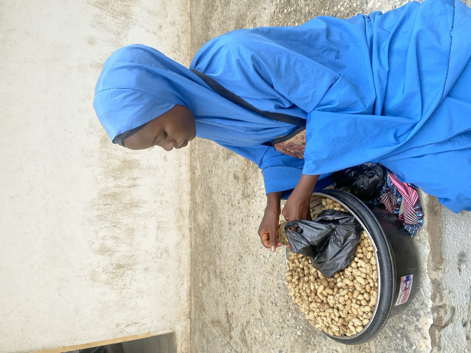 An outdoor scene in an unspecified city in Nigeria depicts a young female, dressed in a light blue hijab and matching long-sleeved garment, seated on a concrete surface. She is actively transferring shelled peanuts from a large, black plastic basin, filled with numerous peanuts, into a small black plastic bag held open by her hands. A second small black plastic bag and a piece of colorful patterned fabric are visible on the ground near the basin. The immediate environment consists of light grey concrete flooring. The background features a textured, light-colored wall exhibiting discoloration and wear, with a dark vertical opening partially visible on the far left.