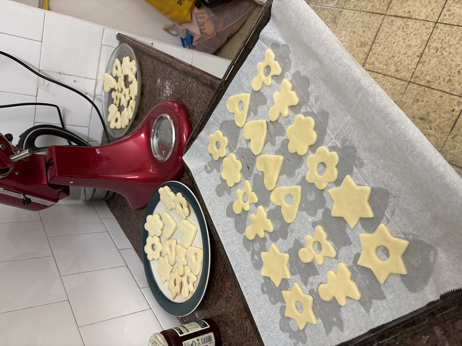 The image depicts an indoor kitchen scene in Tel Aviv-Yafo, Israel, focusing on cookie preparation