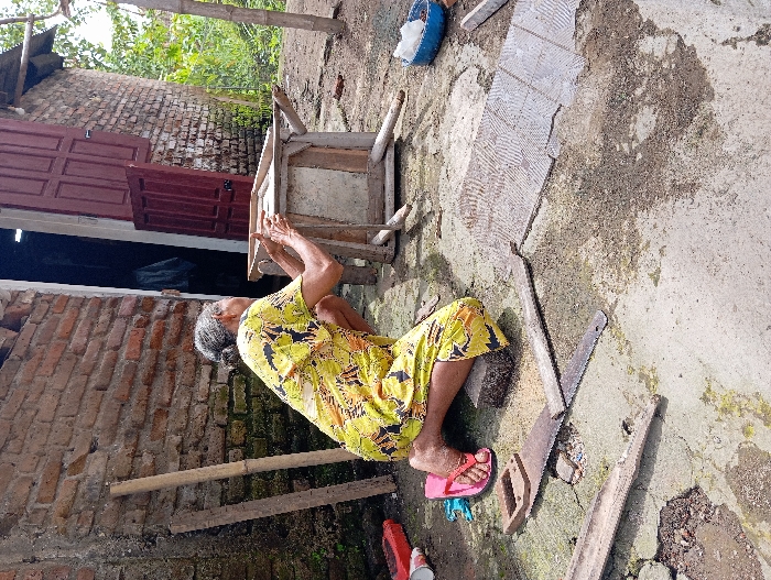 In the city of Waung, Indonesia, an outdoor scene unfolds on a cracked concrete surface. An elderly woman, with grey hair pulled into a bun, kneels on the ground. She wears a yellow short-sleeved garment with a black pattern and a single pink flip-flop on her left foot; her right foot is bare, resting on a small dark block. Her hands are actively placed on a rudimentary wooden frame or table, constructed from unpainted timber, indicating engagement in a manual task. Behind the woman, a distressed brick wall, partially covered with grey plaster, forms the backdrop. A maroon-colored wooden door, featuring paneling, stands partially ajar on the right side of this wall, revealing a dark interior with what appears to be hanging laundry. Further to the right, another brick wall and green foliage are visible. On the concrete surface in front of the woman are two long, flat metal objects resembling saw blades, alongside several wooden planks and offcuts. To the far left, a red plastic container, a white plastic cup, and a blue plastic item are present. To the right, a blue plastic bowl containing a light-colored granular substance and a rectangular light-colored object are visible. The ground is uneven, displaying patches of bare soil and scattered debris under bright daylight.