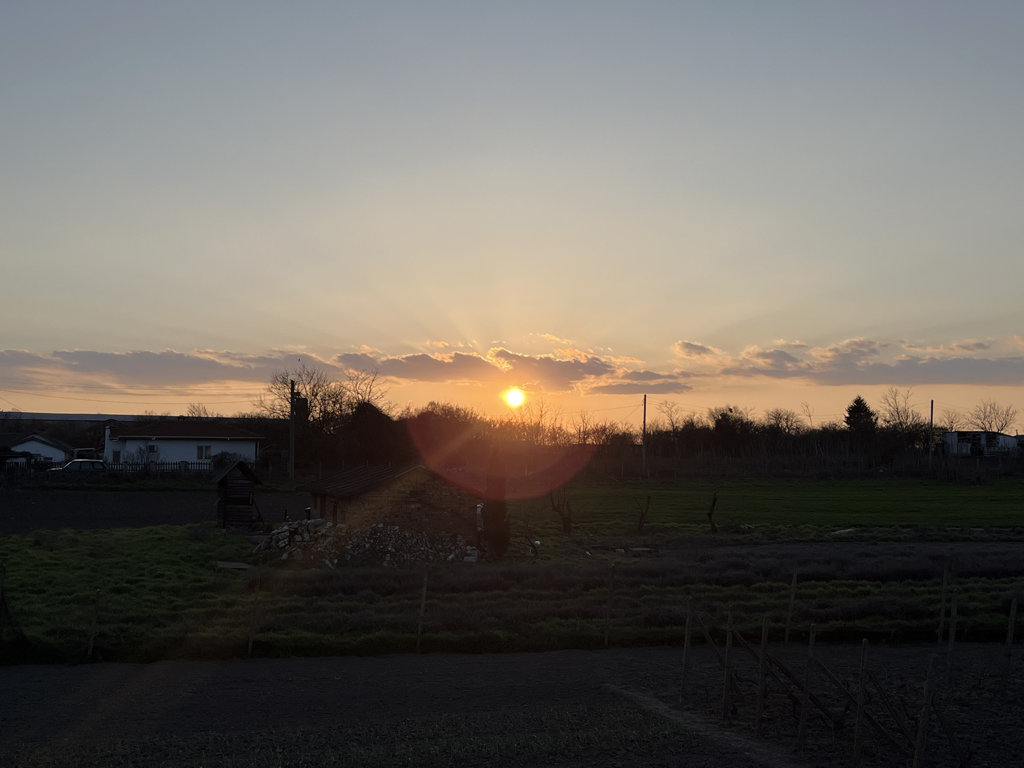 The image depicts a rural landscape within General Toshevo, Bulgaria, captured during sunset. The sky, which occupies the upper two-thirds of the frame, displays a gradient from light blue at the zenith to vibrant orange and yellow hues near the horizon. The sun is centrally positioned and low, emitting visible rays through scattered cumulus clouds, which are illuminated in shades of orange, pink, and grey. A distinct circular red lens flare is present, centered on the sun's location. The horizon line is defined by a dense arrangement of primarily bare deciduous trees and some darker evergreen trees, casting a dark silhouette against the illuminated sky. In the midground, from left to right, a white single-story house with a dark roof and a white fence is partially visible, with a light-colored vehicle parked in front. Adjacent to this, a small, dark wooden shed stands, followed by a larger, dilapidated structure made of stone or wood, with a pile of rocks or debris nearby. The terrain in the midground consists of dark green grass patches and darker, possibly cultivated, land. The foreground is composed of dark, tilled earth, crisscrossed by several vertical wooden posts, likely trellises or fencing elements. No individuals are present in the scene. The overall lighting suggests the golden hour, with long shadows and backlit elements appearing dark.