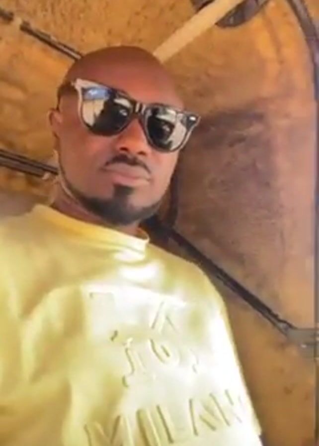 A man wearing sunglasses and a light-yellow t-shirt sits inside a motorized tricycle and looks towards the camera while the tricycle is moving. The man is bald and has a neatly trimmed goatee. The interior of the tricycle has a tan-colored roof and dark bars. The view outside the tricycle’s open side shows a residential area. Someone is walking in the background. The tricycle is shaking.