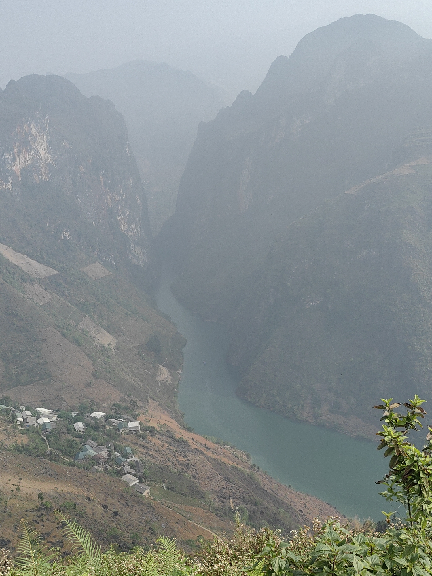 hazy, elevated view overlooking a river valley in Mèo Vạc Commune, Vietnam. Towering, steep mountains frame the river, obscuring distant details due to atmospheric haze. A small cluster of buildings, likely a village, dots the hillside on the left side of the image. The terrain is characterized by steep slopes and sparse vegetation. In the foreground, foliage and small flowering plants are visible.