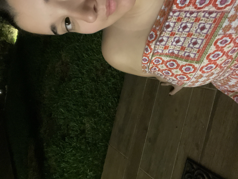 The image displays an outdoor nighttime scene. A female individual occupies the right half of the frame, captured in a close-up, upward-angled self-portrait. Her right facial profile, from mid-nose to the right temple, is visible, alongside her right shoulder, upper torso, and a portion of her right arm and hand. She has an open right eye and a neutral to slightly smiling closed-lip expression. She wears a strapless garment, likely a dress or top, patterned with repeating floral and geometric motifs in red, orange, purple, green, and white. Her right hand, featuring dark-painted fingernails, rests near her lower torso. The foreground consists of a wood-look tiled surface, indicative of a patio or deck, extending from the bottom-left towards the bottom-right. A dark, patterned mat is partially visible in the bottom-left corner. Adjacent to this tiled area, occupying the left and upper-left sections, is a manicured patch of green grass. The background is dark, consistent with low ambient light or night conditions, with faint, indistinct light sources present in the distant upper-right. The specific location within Coatzacoalcos, Mexico, is not visually discernible from the image; however, the environment suggests a residential or private recreational outdoor area.