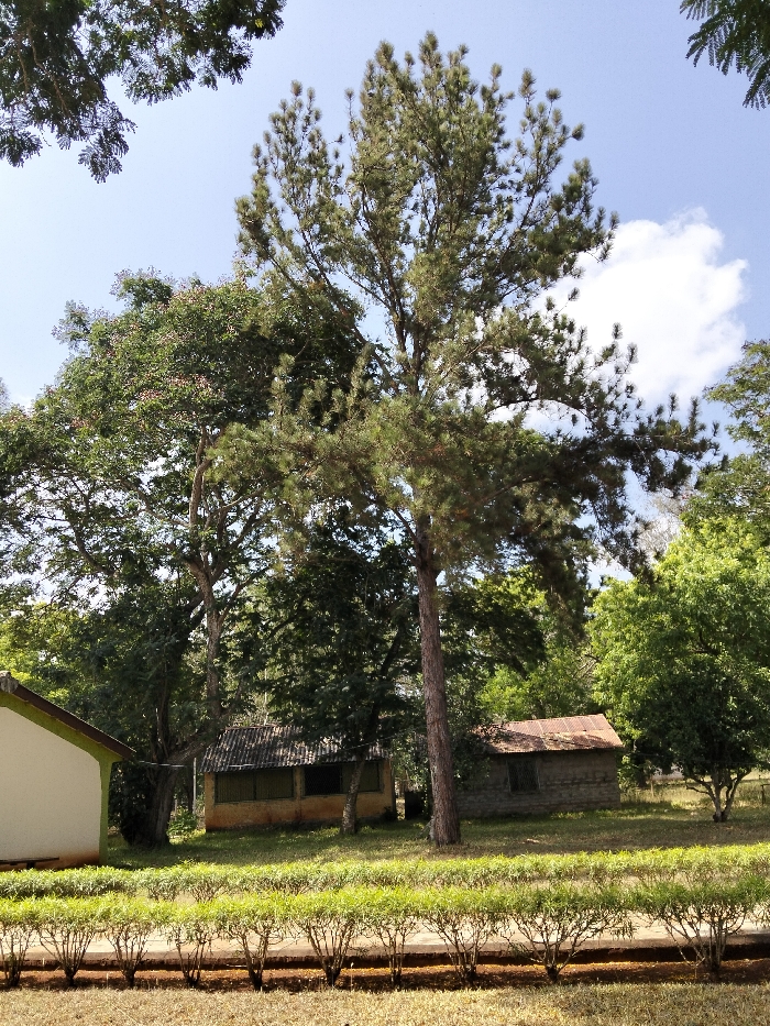 A landscape scene featuring various trees, including a prominent tall pine, under a partly cloudy sky. Two small buildings are visible, one with a yellow wall and another with a rusty tin roof. A trimmed hedge line separates the foreground from the grassy area with the buildings. The lighting appears to be bright, suggesting a sunny day.