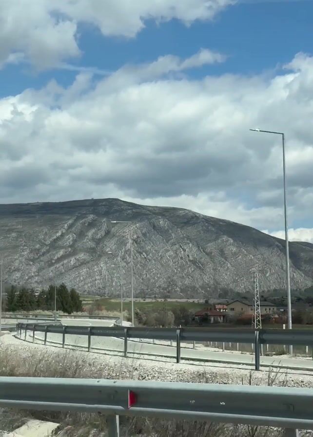 view from a moving vehicle on a highway. The camera is looking out the passenger side window. A blue and white road sign with a double-arrow symbol indicating a divided highway is visible. Beyond the sign, there is a green field with a few houses. In the background, there is a large, rocky mountain under a sky with scattered white clouds. The car is moving steadily along the highway.