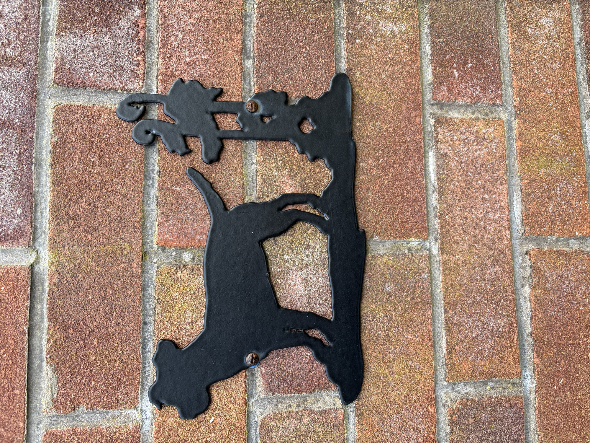 black, wrought-iron dog silhouette, seemingly a decorative bracket, affixed to a brick wall