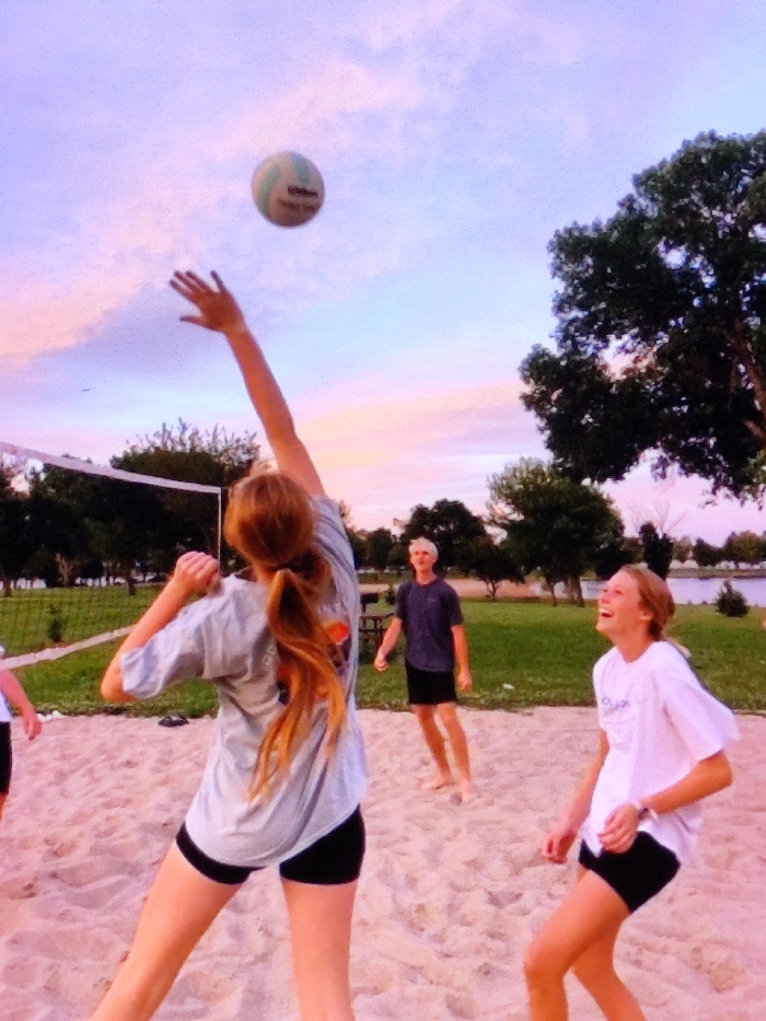 - "The image depicts an outdoor beach volleyball game at what appears to be dusk or dawn, given the purple, pink, and blue hues in the sky" by FM-DQLU42, licensed under CC BY 4.0