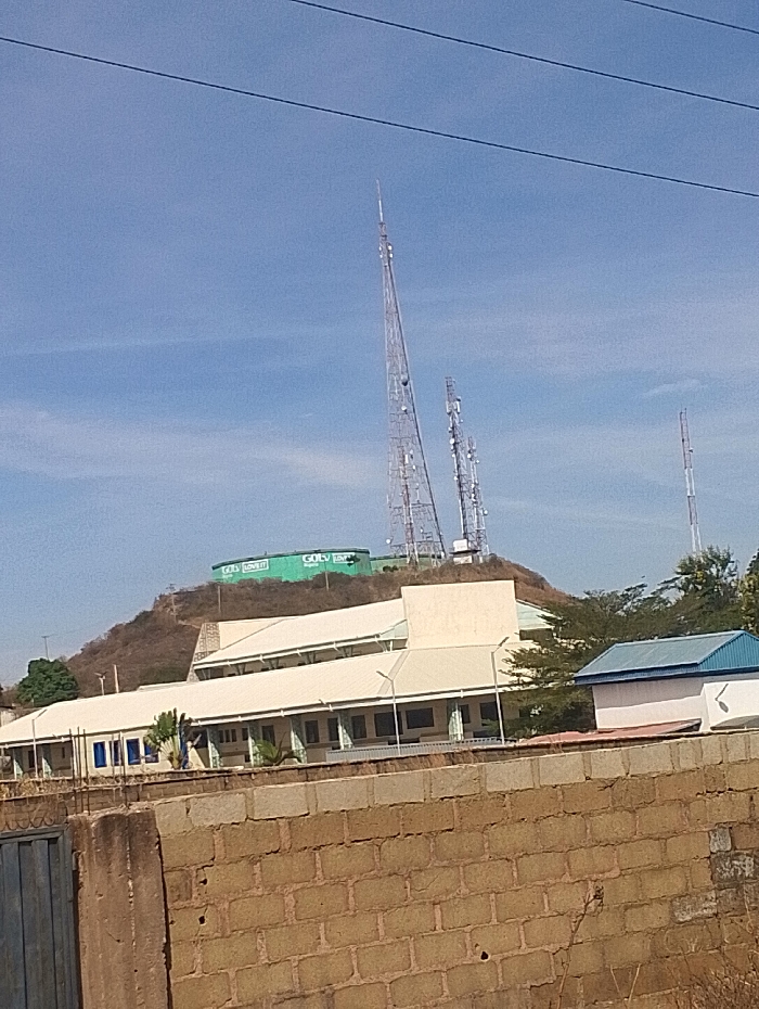 The image depicts an outdoor, elevated perspective under a clear blue sky in Jos, Nigeria, focusing on a hill utilized for utility and telecommunication infrastructure