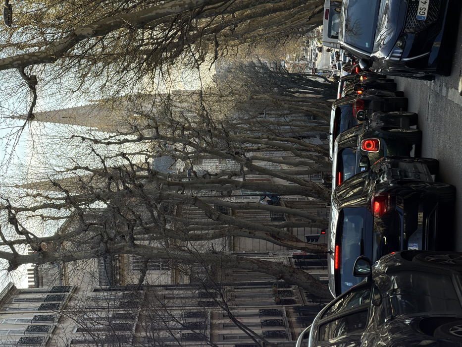 The image depicts a congested street in Marseille, France, specifically looking towards the Eglise Saint-Vincent-de-Paul, suggesting the view is along or leading to La Canebière. The scene captures multiple vehicles stationary in traffic, occupying at least two lanes of a paved roadway. In the immediate foreground on the left, the rear quarter of a dark SUV or crossover is visible. Directly behind it, a dark hatchback, possibly a Volkswagen Polo, displays illuminated red taillights. Its rear license plate shows "13 FR," indicating the Bouches-du-Rhône department. A dark green Mini Cooper hatchback is visible further back in the same lane. On the right side of the foreground, the front of a dark Peugeot 208 hatchback is angled towards the viewer, showing its grille and a license plate partially obscured, displaying "GS-4XX-XX." The street is lined on both sides by tall, multi-story buildings of classical European architecture, featuring numerous windows and wrought-iron balconies. Bare deciduous trees with gnarled branches, likely plane trees, stand between the buildings and the street, forming an avenue effect. A red traffic light is visible on a pole among the trees on the left. In the mid-distance, traffic continues down the street, and individuals are indistinctly visible on sidewalks or within vehicles. Dominating the distant background are the two distinct, light-colored stone spires of the Eglise Saint-Vincent-de-Paul, rising prominently above the tree line against a bright, hazy sky. The overall lighting suggests daylight, possibly late afternoon or early morning, with sunlight illuminating the distant church.
