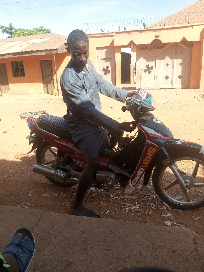 The image displays an adult male seated on a red and black underbone motorcycle in Rigasa, Nigeria, under a clear, bright sky