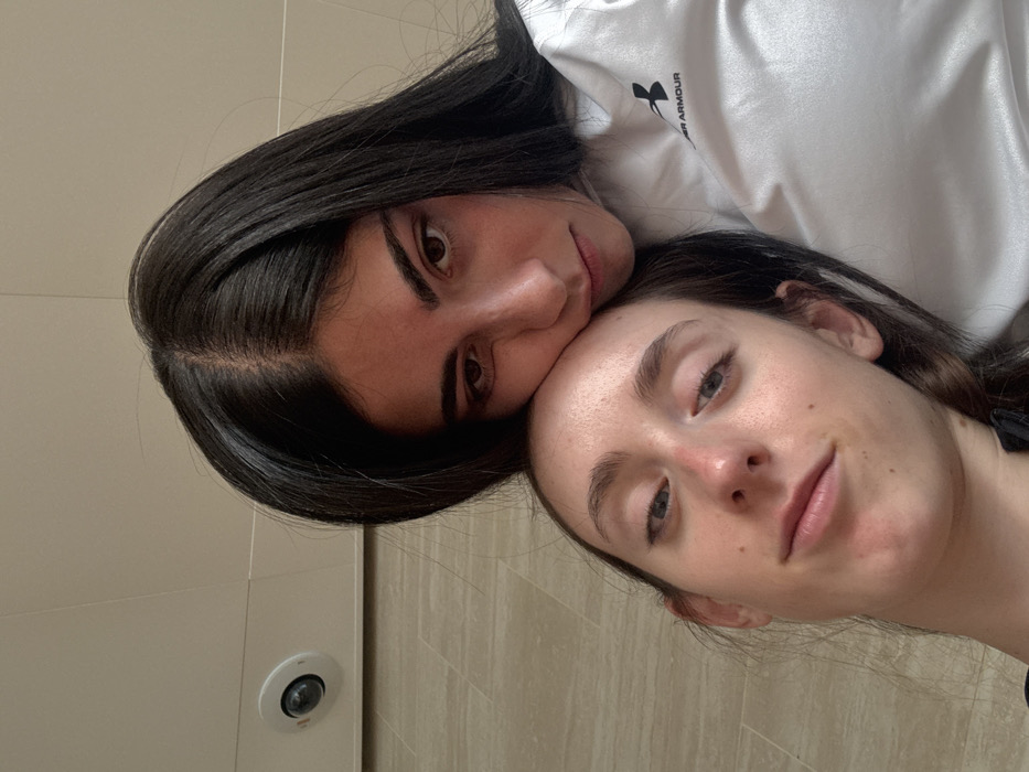 This image, taken in the Berry Islands, Bahamas, captures two young adult females in a close-up, indoor setting. The subject in the foreground, positioned lower in the frame, has light brown hair and a neutral expression while looking directly at the camera. The second subject, situated behind and above, rests her head on the first subject's head. She has long dark hair, dark eyes, and a serious expression directed towards the camera. This individual wears a white long-sleeved shirt featuring an "Under Armour" logo on the left chest. The background shows light-colored walls and similarly toned rectangular floor tiles. A white dome-shaped surveillance camera is mounted high on the wall in the upper left corner of the frame.
