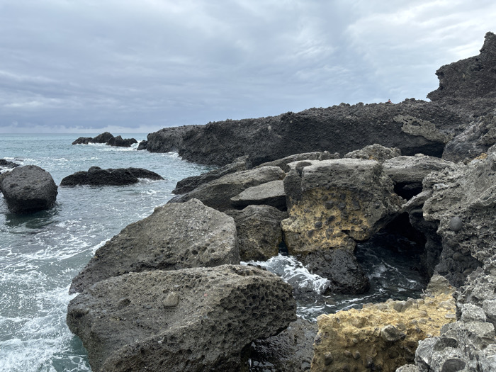 A rocky coastline under a cloudy sky features large, dark volcanic rocks