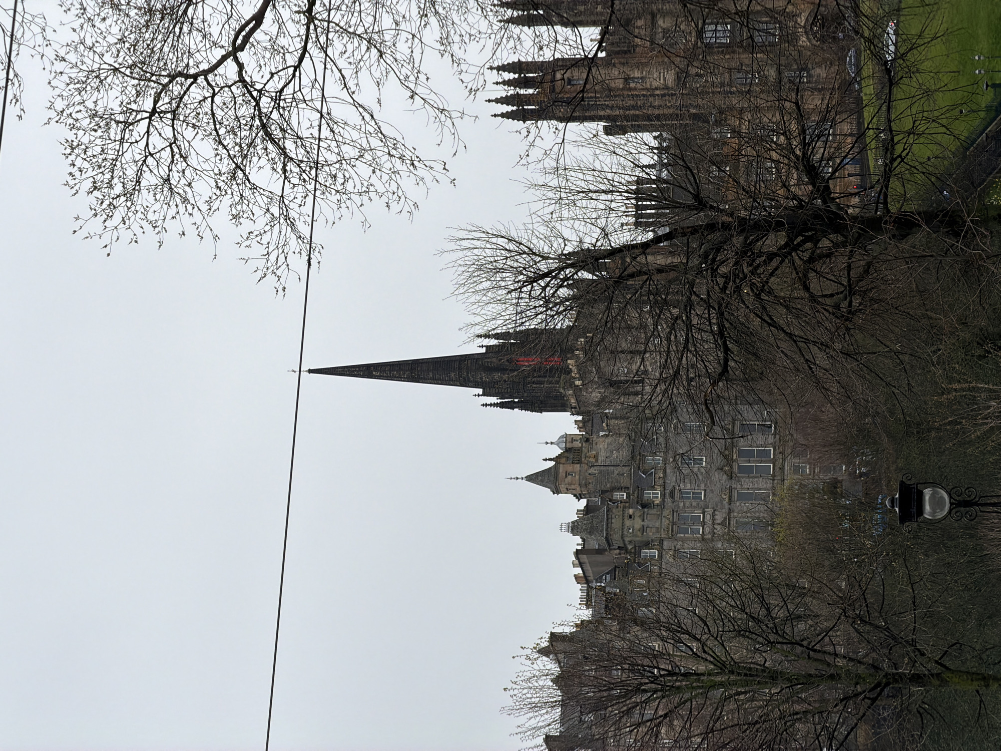 The photograph captures a view in the city of Edinburgh, United Kingdom, featuring several historic buildings under an overcast sky. Dominating the scene are structures with pointed roofs, including the spire of a church, rendered in grey stone. The building styles vary, with one exhibiting multiple towers and ornate detailing. Bare tree branches are intertwined throughout the foreground, partially obscuring the architectural details and adding depth to the composition. In the bottom right corner, a vintage lamppost is visible. A dark wire cuts across the top portion of the frame, leading to the tallest spire. The overall tone is muted, reflecting the gloomy weather.
