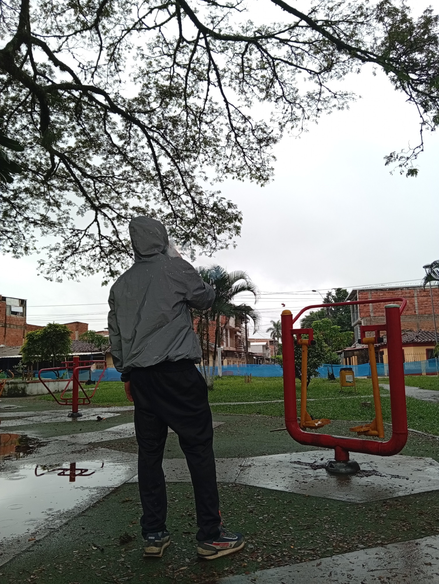 The image displays an outdoor public exercise park in Jamundí, Colombia, under an overcast sky. A lone individual stands in the center-left foreground, facing away from the camera towards the right. The person wears a grey hooded jacket, black athletic pants, and athletic shoes with visible branding on the heels. Their right hand is raised to their face, holding a translucent object near the mouth. The immediate ground is a dark green/grey paved surface covered with numerous puddles and water droplets, indicative of recent rainfall. To the right of the individual, a red outdoor exercise machine with yellow foot pedals is present. A second red exercise structure is partially visible in the left background, behind the person. Beyond the paved area, green grass extends into the mid-ground. The background features residential buildings constructed of red brick, interspersed with various trees including palm trees, and overhead power lines. A blue mesh fence or barrier is visible in the mid-distance on the left, and a yellow trash receptacle is situated in the mid-distance on the right.
