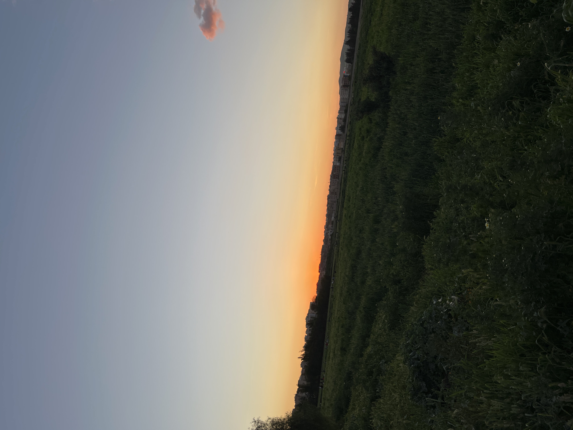 landscape at dusk or dawn, possibly in Fez, Morocco, given the location request. The left side of the frame features a gradient sky, transitioning from light blue to orange near the horizon. A small, reddish cloud is visible in the upper left. The right side of the frame is dominated by a field of dense, dark green vegetation. A line of buildings is visible along the horizon where the sky and field meet.