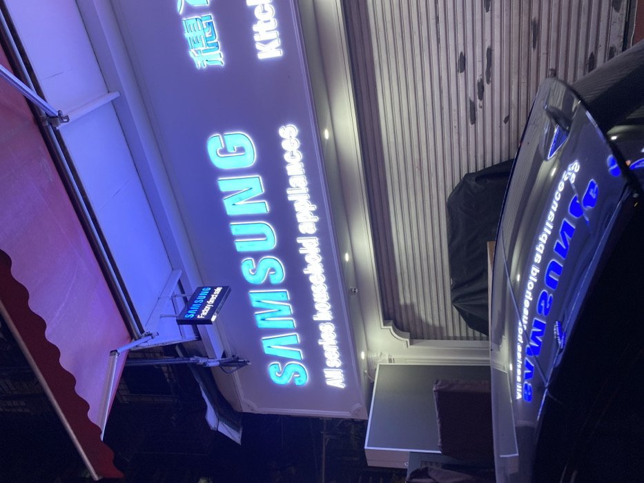 This image depicts a nighttime scene in Yuexiu District, China, focusing on a closed storefront. The prominent feature is a large, illuminated sign displaying "SAMSUNG" in cyan-blue letters, with "All series household appliances" in smaller white letters beneath it. A smaller, rectangular hanging sign to the left also reads "SAMSUNG Factory direct sale" in blue text. To the right of the main Samsung sign, partially visible Chinese characters "德惠" are illuminated in blue, alongside the word "Kitchen" in white. A red retractable awning extends above the signs. The storefront entrance is secured by a metal rolling shutter, which exhibits visible signs of wear and peeling paint. A small security camera is mounted below the "All series household appliances" text. To the left of the shutter, a brown rectangular object and a larger grey object are present. A dark tarp covers an unidentified object directly in front of the shutter. In the immediate foreground, the dark, reflective roof of a vehicle captures the inverted blue illumination of the "SAMSUNG" sign and other text.