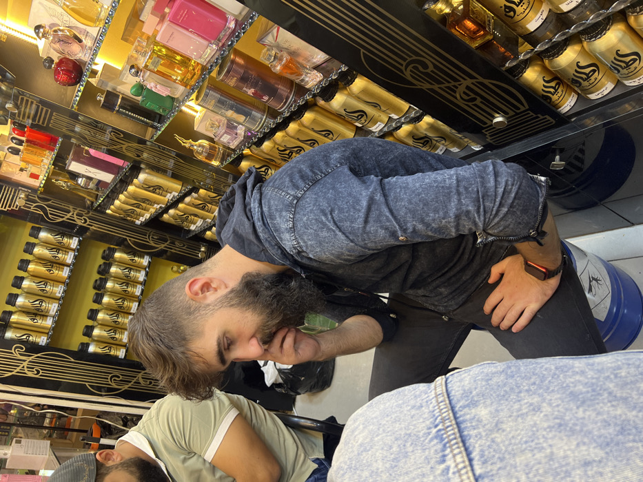 The scene is an indoor retail establishment located in Barza Municipality, Syria, featuring two adult males and merchandise displays. In the mid-ground, a male with a dark, full beard and styled brown hair is seated on a blue barrel, serving as a stool. He wears a faded blue denim-style hooded shirt with rolled sleeves and dark trousers, and a red smart-watch on his left wrist. His left hand is positioned near his chin, while his right hand rests on his leg. To his left, a second male is partially visible, wearing a light green polo shirt and a grey cap, seated with arms crossed, facing away from the camera. A black plastic bag is on the light-colored tiled floor between them. The background features brightly illuminated retail shelving against a yellow-green wall. The left shelves display multiple rows of identical gold-colored aerosol cans with black caps and Arabic script. The right shelves showcase an assortment of perfume bottles in various shapes, sizes, and colors, along with boxed items. Black vertical panels with gold geometric patterns decorate the shelving units. A person's light-wash denim-clad leg is visible in the bottom left corner, suggesting a third individual partially in frame.