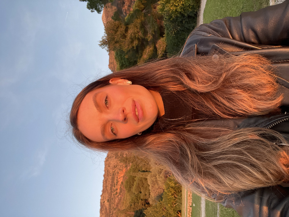 A female subject is depicted in a medium close-up, centered and looking directly at the camera. She has long, wavy brown hair with lighter highlights, blue eyes, and a slight smile with parted lips. She is wearing a black turtleneck sweater and a black leather jacket, with a textured stud earring visible on her right ear. The scene is illuminated by warm, golden hour light, particularly on the subject's right side (viewer's left). The background, consistent with the city of Sveti Stefan, Montenegro, features a landscape of dry, scrub-covered hills, various green trees including cypress-like species, and sections of manicured green grass with visible dirt pathways. The sky above is clear and pale blue, with a faint contrail visible in the upper right quadrant.