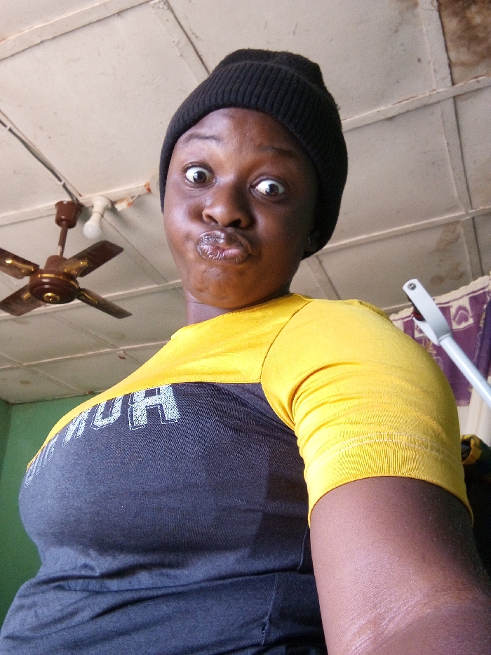A woman in a black beanie and yellow-and-black shirt makes a comical face with wide eyes and pursed lips. A ceiling fan with four blades is visible in the upper left corner. The ceiling is white with dark trim, and a cleaning apparatus leans against a patterned curtain in the background. The woman's skin appears smooth, and she fills most of the frame.