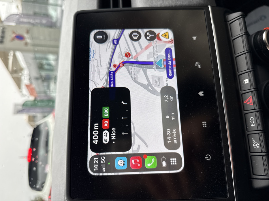 The image depicts the interior of a vehicle, primarily focusing on its infotainment screen, with a blurred view of the exterior through the windshield. The infotainment screen displays Apple CarPlay navigation, indicating the vehicle's location in Mougins, France, near the intersection of roads like "Route des Alliés" and "Route du Cannet," close to businesses such as "Renault Retail Group" and "Volkswagen Vehicules Utilitaires Riviera Technic SA." The navigation shows a current instruction to proceed 400 meters towards "Nice" via routes N 42, A8, and E80, with an estimated arrival time of 14:30, 9 minutes, and 7.2 kilometers. The current time is 14:21, and the vehicle is stationary (0 km/h). Raindrops are visible on the windshield, suggesting overcast or rainy weather. Beyond the windshield, blurred commercial buildings and a portion of a white car with a red brake light are visible. Below the infotainment screen, physical vehicle control buttons are present, including "A OFF" (Start/Stop disable), "ECO," and a hazard light switch. No individuals are visible in the scene.