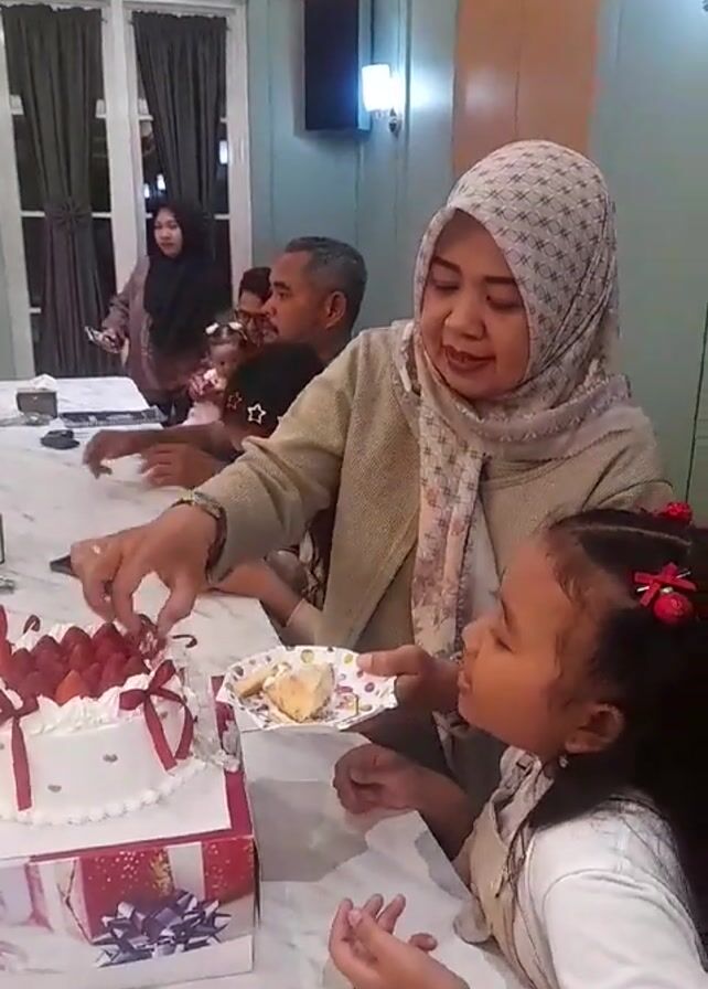 woman in a hijab handing a piece of cake to a young girl at a table. The woman is wearing a light beige jacket and a patterned headscarf. The little girl has dark hair adorned with red bows. Other people are visible at the table, including a man and two young girls. A woman in a black hijab is visible in the background, holding a baby and taking a picture with her phone. A birthday cake decorated with strawberries and red ribbons sits on the table, next to a box with gift wrapping. The scene takes place indoors in a room with light green walls and a large window in the background. The people at the table are engaged in a birthday celebration, sharing cake and capturing the moment with their phones.