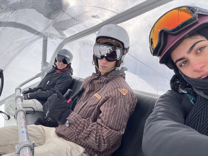 Three individuals are seated from right to left on a covered ski lift chair in Valtournenche, Italy