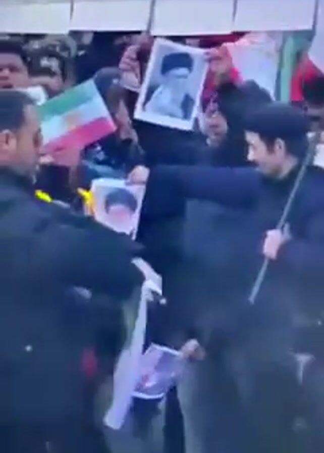 A crowd of people are gathered, some holding Iranian flags and pictures of what appears to be a deceased person. The people in the crowd seem to be chanting or speaking loudly. It's unclear what the event is, but the flags and pictures suggest it might be a demonstration or memorial.