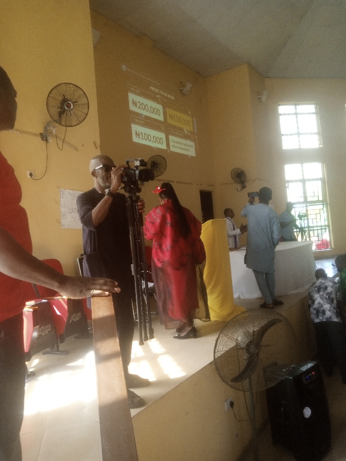 This image depicts an indoor event in Nsugbe, Nigeria. A bald, bearded man wearing sunglasses and dark clothing operates a professional video camera mounted on a tripod, positioned in the center-left. To his right, a woman in a flowing red garment with long dark hair moves towards a raised stage area. This stage is furnished with a white-draped table and a yellow fabric panel. On the stage, several individuals are visible, including one in a light blue tunic and another in a white shirt with a dark sash. The background wall, painted yellow, serves as a projection surface displaying "PRIZES TO BE WON" with specific monetary values: ₦200,000, ₦150,000, ₦100,000, and "Consolation prize for other contestants." Multiple wall-mounted fans are visible, along with a floor-standing fan and an adjacent speaker unit in the lower right. Bright daylight illuminates the scene from large windows fitted with security bars on the right wall. Red upholstered chairs, branded "Jetfune," are partially visible in a foreground seating area on the left.