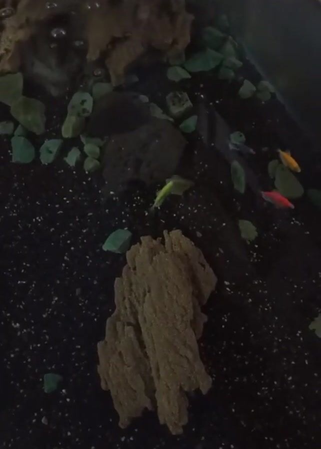small aquarium with a black gravel substrate. Scattered on the gravel are several bright green decorative stones. There are two brown, sponge-like decorations: one larger in the lower-center of the frame, and another smaller and partially obscured in the upper-left. A few small, colorful fish, including yellow, red, and neon green varieties, swim in the water. The water appears clear with a few air bubbles visible near the surface. The lighting is somewhat dim, creating a slightly dark ambiance inside the aquarium.