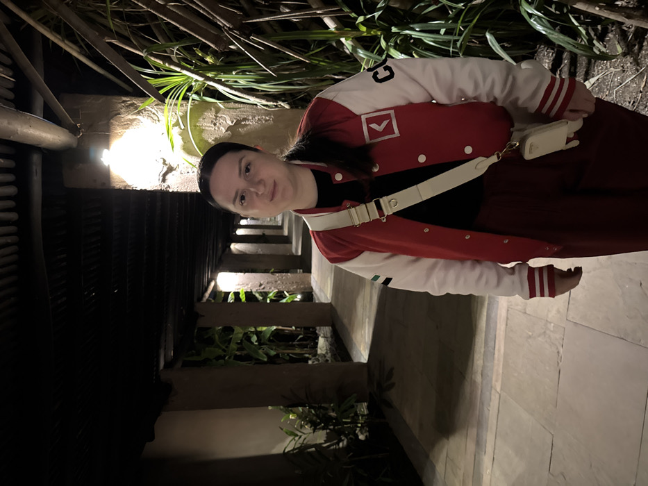 A female individual stands centered in an illuminated covered walkway at night in Bhopal, India. Her gaze is directed towards the camera. She wears a red and white varsity jacket with a black top underneath and dark red pants. The jacket features a red "V" on a white square patch on the left chest, "CU" on the right chest, and a green, white, and black striped patch on the left sleeve. A light-colored cross-body bag with a small attached pouch hangs across her torso. The walkway features a series of thick, textured pillars supporting a dark, slatted wooden ceiling. Wall-mounted light fixtures are visible on several pillars, casting downward illumination. The floor is paved with light-colored flagstones. Lush green foliage, including broad-leafed plants, lines both sides of the walkway, particularly visible between pillars and along the right edge of the frame. The walkway recedes into the background, showing additional pillars and lights. The precise facility within Bhopal, India, is not discernable from the image.