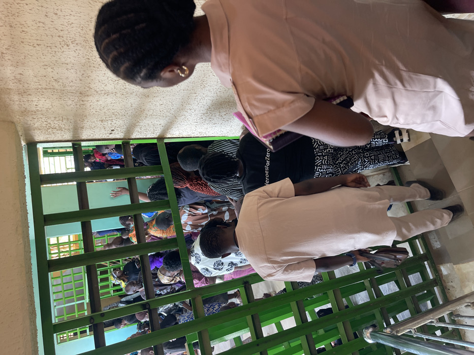 The scene depicts an interior or semi-interior crowded area within Kufena, Nigeria, viewed from a slightly elevated position looking downwards. In the immediate foreground, three individuals are positioned on steps, oriented away from the camera. The leftmost individual wears a light tan traditional garment and holds a dark brown bag in their left hand, descending a step. The central individual wears a black t-shirt with white text reading "HeroesForZero" and black and white patterned trousers. The rightmost individual, a female, wears a light pink short-sleeved top, has braided hair pulled back, gold hoop earrings, and holds a dark purple folder or notebook in her left arm. These individuals are facing towards a dense crowd situated beyond a prominent green metal grate that spans the mid-ground. This grate consists of vertical and horizontal bars. The crowd beyond is tightly packed, comprising numerous individuals of varying ages and genders, wearing diverse clothing including patterned fabrics and solid colors. One person in the upper mid-ground within the crowd has their right hand raised. The background features light-colored walls, some appearing green, with openings suggesting windows or doorways admitting ambient light. The wall immediately to the right of the foreground individuals is textured, off-white stucco. A metal handrail is partially visible on the left side of the steps. The overall activity suggests a gathering or a queuing situation.