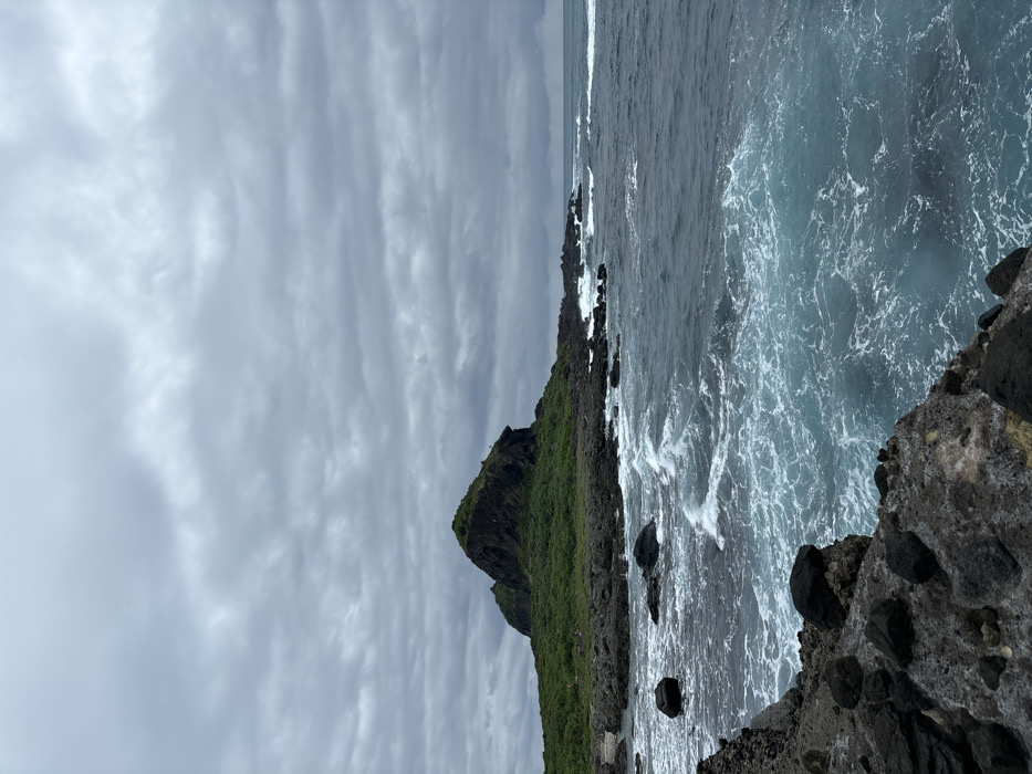 A coastal scene unfolds under a sky thick with striated clouds. Turquoise ocean water surges against a rocky shore, white foam cresting on the waves. A small, green-covered landmass juts from the sea, its steep slopes meeting the water's edge. Rough, dark rocks form the foreground, their porous texture contrasting with the smooth lines of the clouds and the churning sea.