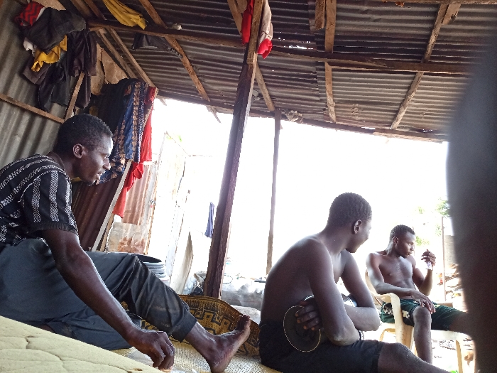 Within a rudimentary structure in Zango-ndaji, Nigeria, three adult males are depicted. The structure features corrugated metal walls and a corrugated metal roof supported by wooden beams, with various garments (red, blue, yellow, black) hanging from the roof frame. The interior includes a mattress-like surface and a patterned mat on the floor. On the left, a man wearing a black and white striped shirt and dark trousers is seated on a light-colored mattress. He is barefoot and looks towards the right. In the center, a shirtless man in dark shorts is seated, holding a round, dark object, possibly a plate or pot lid, with both hands. He also looks towards the right. On the right, a third shirtless man, wearing dark patterned shorts, is seated on a light-colored plastic chair. He holds a clear bottle or glass in his right hand and looks downwards at it. The background outside the structure is brightly illuminated, suggesting strong daylight.