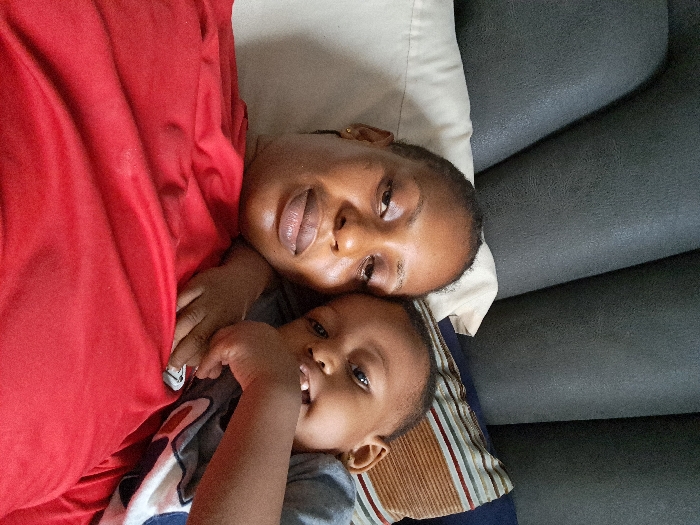 An indoor scene depicts an adult female and a young child lying down. The adult female, of African descent, has a light brown complexion and wears a red top. She is positioned on her back, looking directly at the camera with a neutral expression. Behind her is a dark grey upholstered headboard with vertical channels and a white pillow. To her right, a young child, also of African descent, with a light brown complexion, is positioned next to her, resting their head or upper body against the adult. The child wears a grey t-shirt with a partial graphic design and looks towards the camera with a slightly open mouth, showing teeth. The child's right hand rests on the adult female's red garment. A striped pillow with horizontal bands of brown, white, blue, and green is visible in the upper right background. The setting is consistent with a bedroom or living area in an Unknown location in Unknown, Unknown.